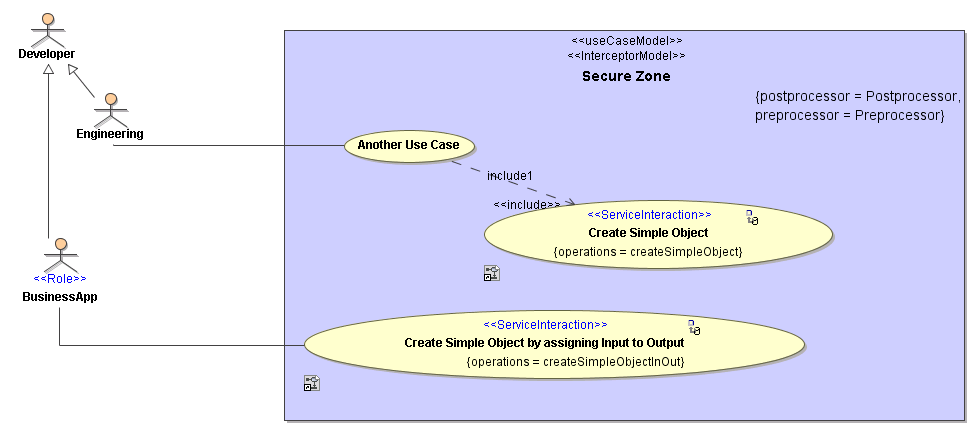 The image below shows how to implement such a hierarchy. The role actors "Engineering" and "BusinessApp" inherit the role "Developer". So the operations "CreateSimpleObject" and "CreateSimpleObjectInOut" can be executed by users having the role "Developer". Users having the role "Engineering" can access only "CreateSimpleObject". Users having the role "BusinessApp" can access only "CreateSimpleObject".