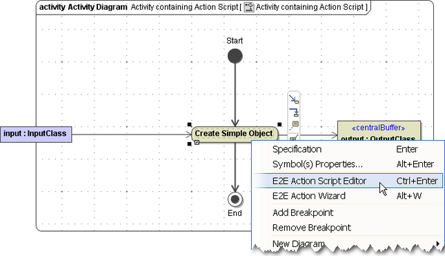 - First, draw all UML elements regarding an activity (an action node with its input and output object nodes including all transitions). This ensures that the Action Script Editor can support you by suggesting these input and output objects when entering the action script.