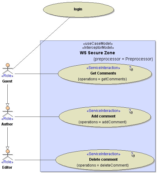 These rights and restrictions are defined within the following use case diagram. The operations used as serviceCalls in the UI State Machine (getComments, deleteComment, addComment) are placed within a Secure Zone and assigned to user roles.