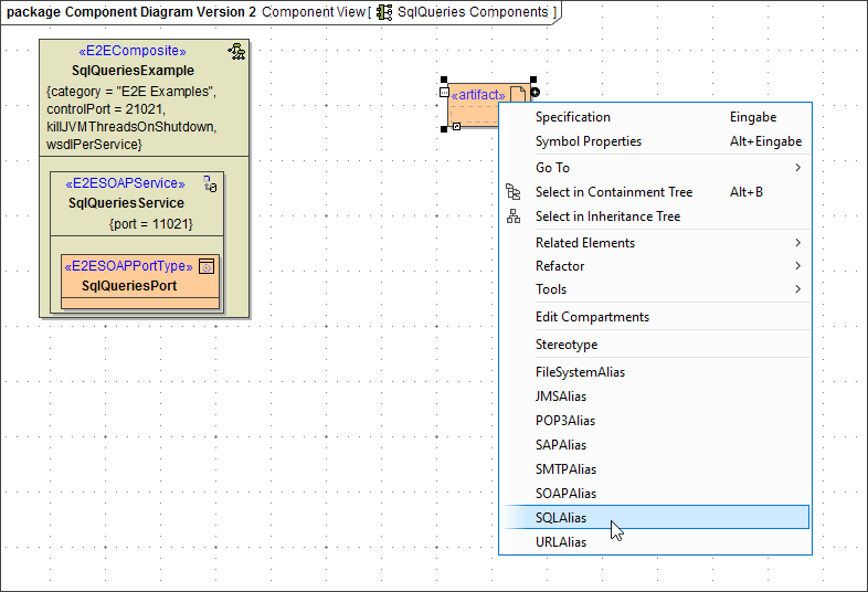 ![]() | Right-click the artifact and assign the stereotype corresponding to the alias you need, in our example SQLAlias. |