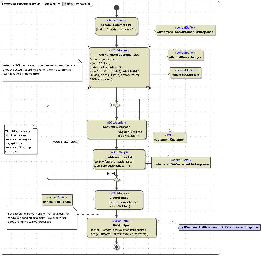 The figure below shows an activity executing these steps. When retrieving the handle, it is possible to define the number of prefetched records (<<SQLAdapter>> action = getHandle, prefetchedRecors = <number>). This number of records is read block wise so that the xUML Runtime does not need to connect to the database for each fetchNext action.