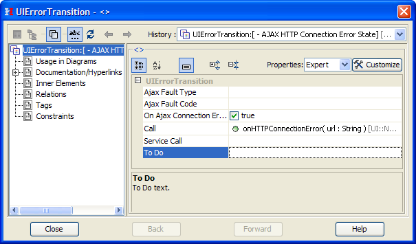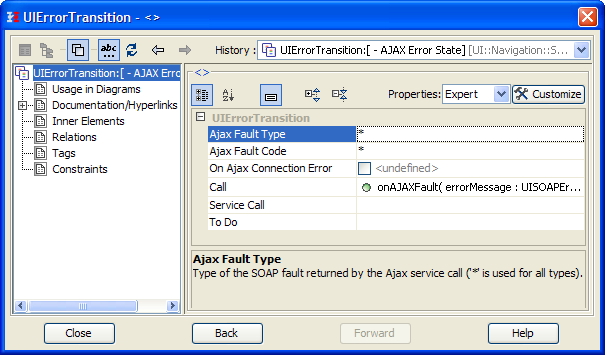 The Exception signal is caught within the <<UIErrorTransition>> where it is sent to a JavaScript operation having this fault event as an input object. The JavaScript operation is defined on the <<UI>> controller and is registered in the call properties of the <<UIErrorTransition>> as seen in below figure.