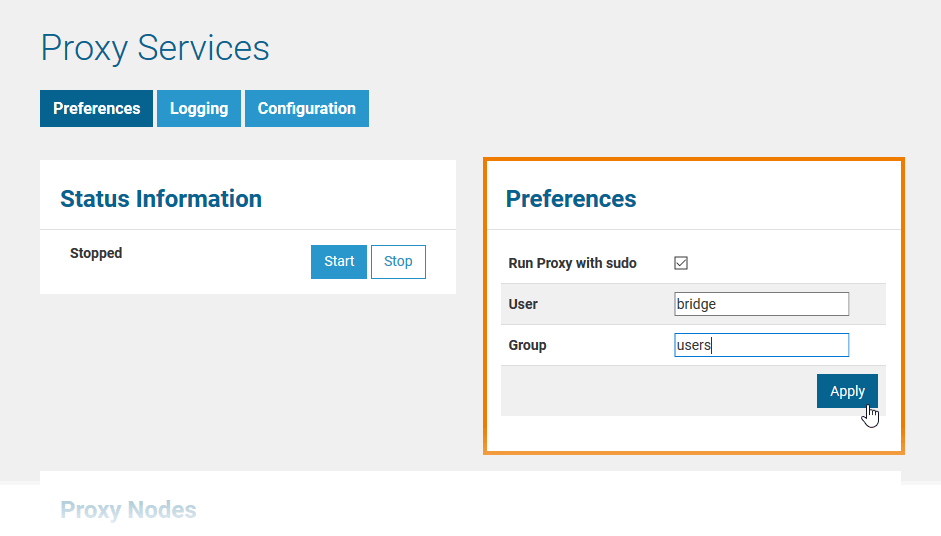 2. In the Bridge, configure the proxy service as to run the proxy with sudo.
