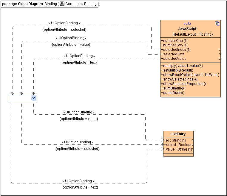 In this example we show bindings from a Combo Box to a <<UI>> controller and from a ListEntry message to the Combo Box. Of course, it is also possible to bind the other way round.