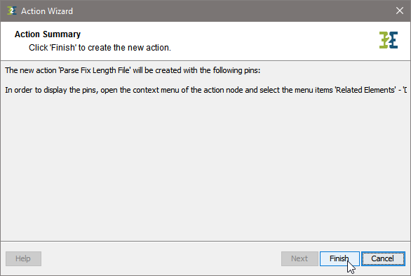 ![]() | The Action Wizard displays a summary of your settings. Click Finish to create the parse action. |