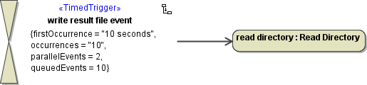 The activity Modeling the Behavior of an Event Observer models the behavior of an Event Observer class by defining the time events and the handlers of the time events. The activity has no initial state. Instead, the targets of both time-triggered transitions define the start points of the event handler. An event handler start point can be any activity, such as the sub-activity Read Directory or a call operation action calling an operation of the Event Observer class (for instance writeLogFile). In Modeling the Behavior of an Event Observer, one time event triggers a lookup in a directory. If this directory contains files, the activity calls the Event Observer operation writeResultFile. The implementation of this sub-activity operation call is not shown here. Refer to the example file.