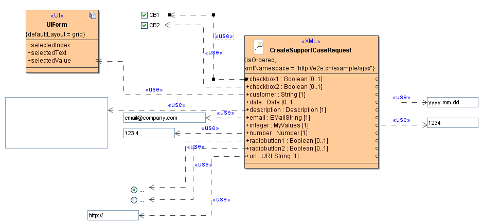 In xUML UI Forms are designed using the standard form input elements which are placed within a container (Panel, Frame, etc.). The actual Form is modeled then in the Binding diagram where each form input element then is bound to a services request input object.