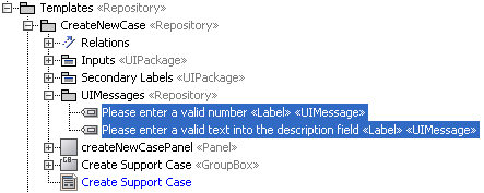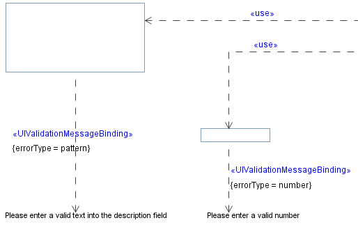 To have a greater flexibility, <<UIMessage>> labels are visible or invisible depending on their location. If a <<UIMessage>> is placed within a container element e.g. a Panel, then the message will be visible on the screen. If the <<UIMessage>> label is drawn outside of the container, then it will be hidden. In the below figure, the label Please enter a valid text into the description field will be displayed on the page while the label Please enter a valid number is hidden and not visible to the user. As a rule, everything modeled on a container UI element will be displayed.