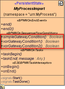 | Overridable <<BPMNOnSequenceFlowCondition>> operations are created for each guard. In this operation the modeler has to evaluate the expression and set the boolean return. |