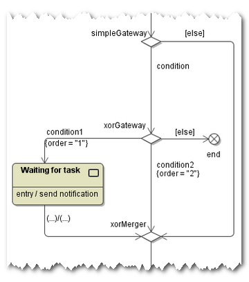 | The gateways are mapped to choices, the sequence flows to transitions. The guards of the transitions are derived by the expression or the name of the sequence flow. |