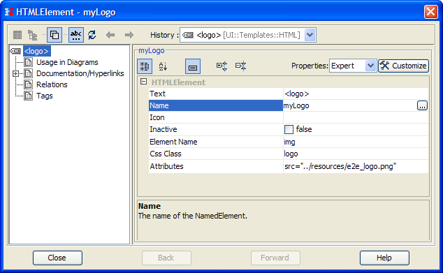 To be able to embed images, a HTML image tag (<img src="path/to/image.png">) needs to be specified. This is done by assigning the <<HTMLElement>> stereotype on a label element. Assign the following settings within the specifications: