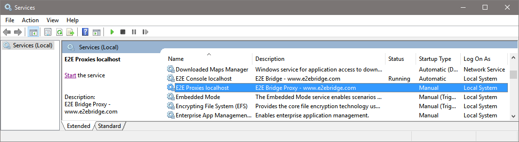 In the Windows Services tool, you can find a service entry E2E Proxies. This service controls the Apache HTTPD and is managed from the Bridge. When a proxy service is started or stopped with the Bridge, the E2E Proxies service will be started or stopped automatically.