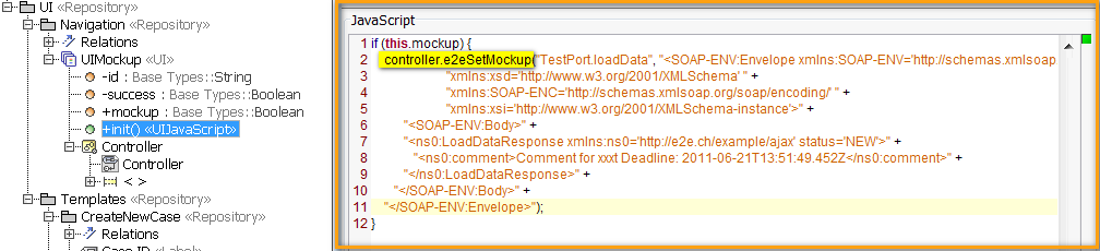 This URL sets the public mockup controller attribute to true (see containment tree below). As the state machine above indicates, the JavaScript operation init is called before reaching the first UI state. In this operation we call the e2eSetMockup operation to set the service response value. The mock-up key is "TestPort.loadData" because the SOAP operation loadData is member of the TestPort class. The following figure shows the init() operation:
