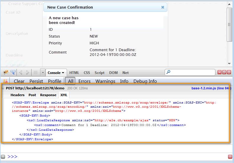 Executing the mock-up example in Firebug shows the response of the loadData service: