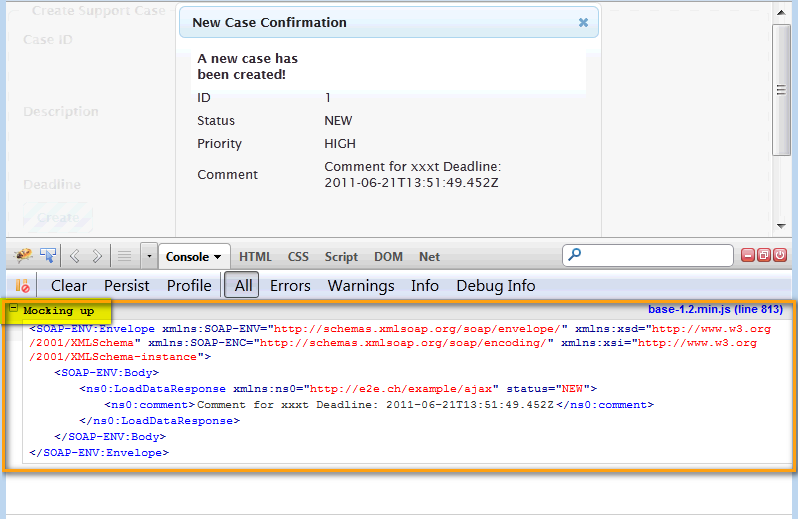 When running the example with mockup=true, the Firebug console now shows that the service is not called anymore but instead the mock-up value has been returned: