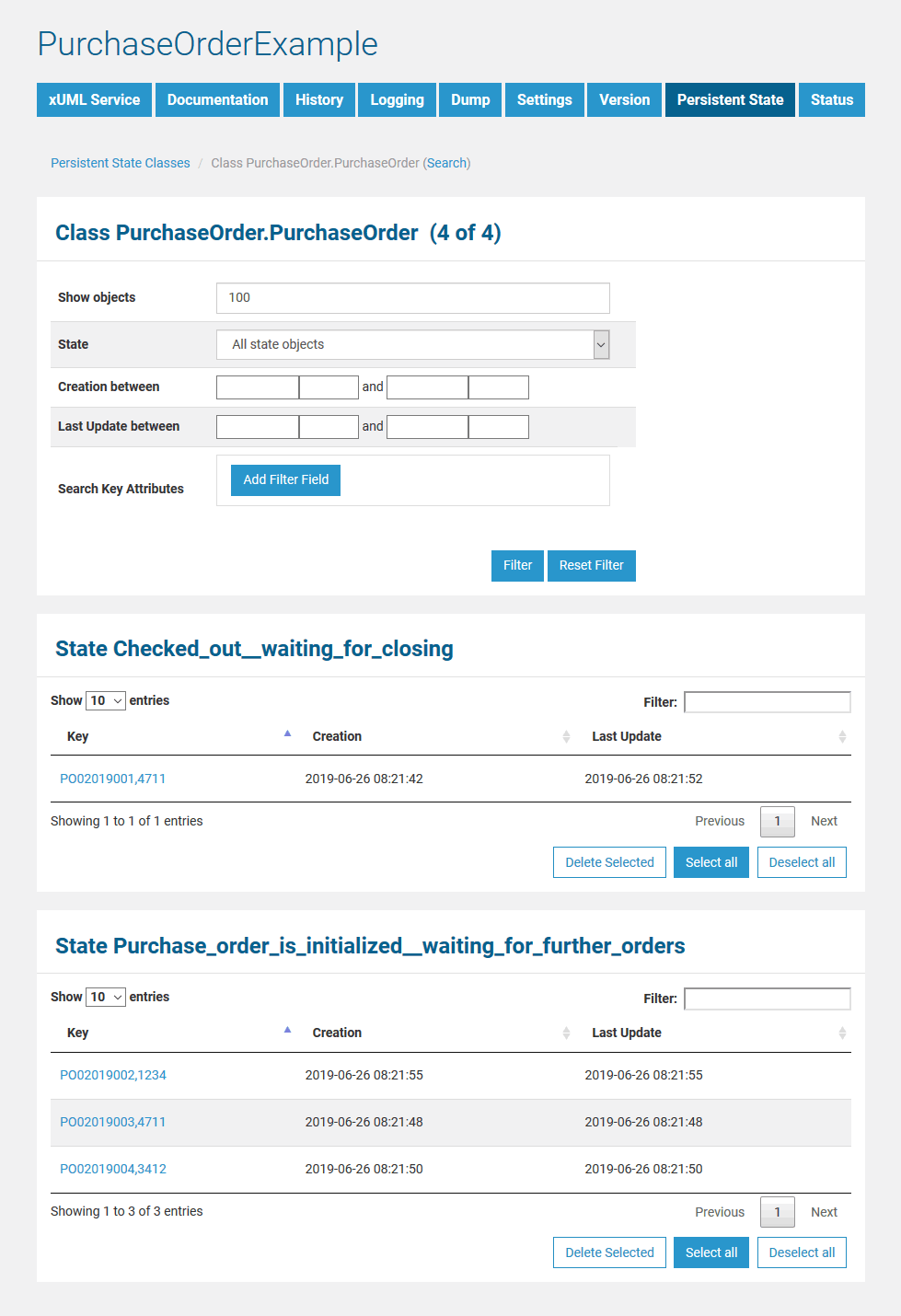 After creating some objects of the persistent state class (e.g. purchase orders), all objects can be listed.