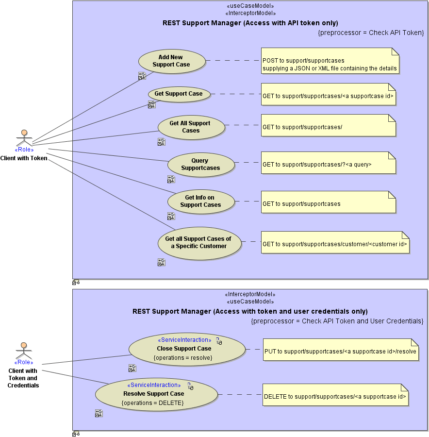 Together with the REST Service features, you can use the normal security interceptor features as described on Security Model pp.
