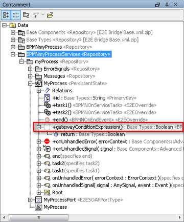 ![]() | In the services package an overridable operation is created for the expression of the conditional sequence flow. It is stereotyped with <<BPMNOnSequenceFlowCondition>> and is invoked in the guard mentioned above. |
