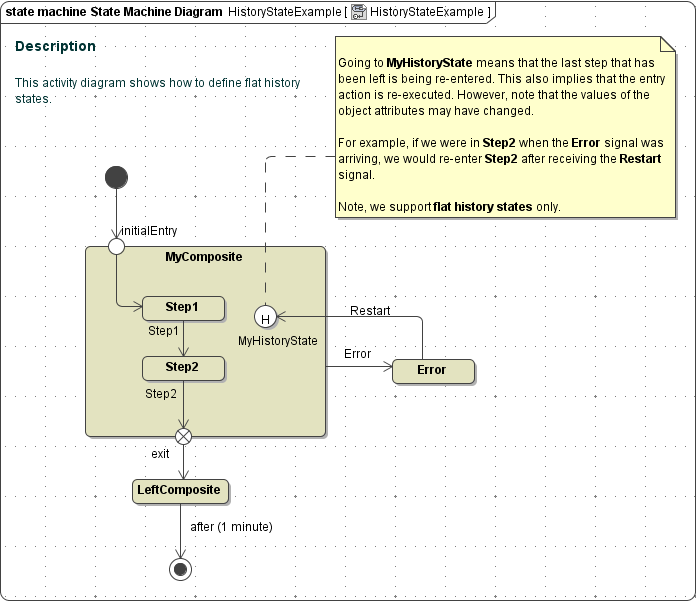 In UML, it is possible to define states within composites that remember the last state the composite had before it has been left. These states are called history states. For example, in the following state diagram the composite MyComposite is in state Step1 or Step2. When the Error signal arrives while the state machine is in Step2, the history state remembers this. Then, if the composite is re-entered receiving the Restart signal, the history state will trigger the re-entry of Step2 - implying the re-execution of the entry action of Step2.