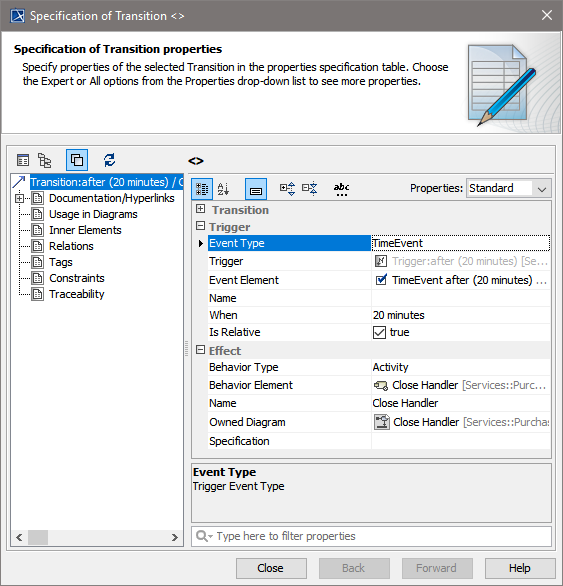 Transitions starting from states can be triggered by signals. The example below shows a transition that is triggered by the CloseSignal.