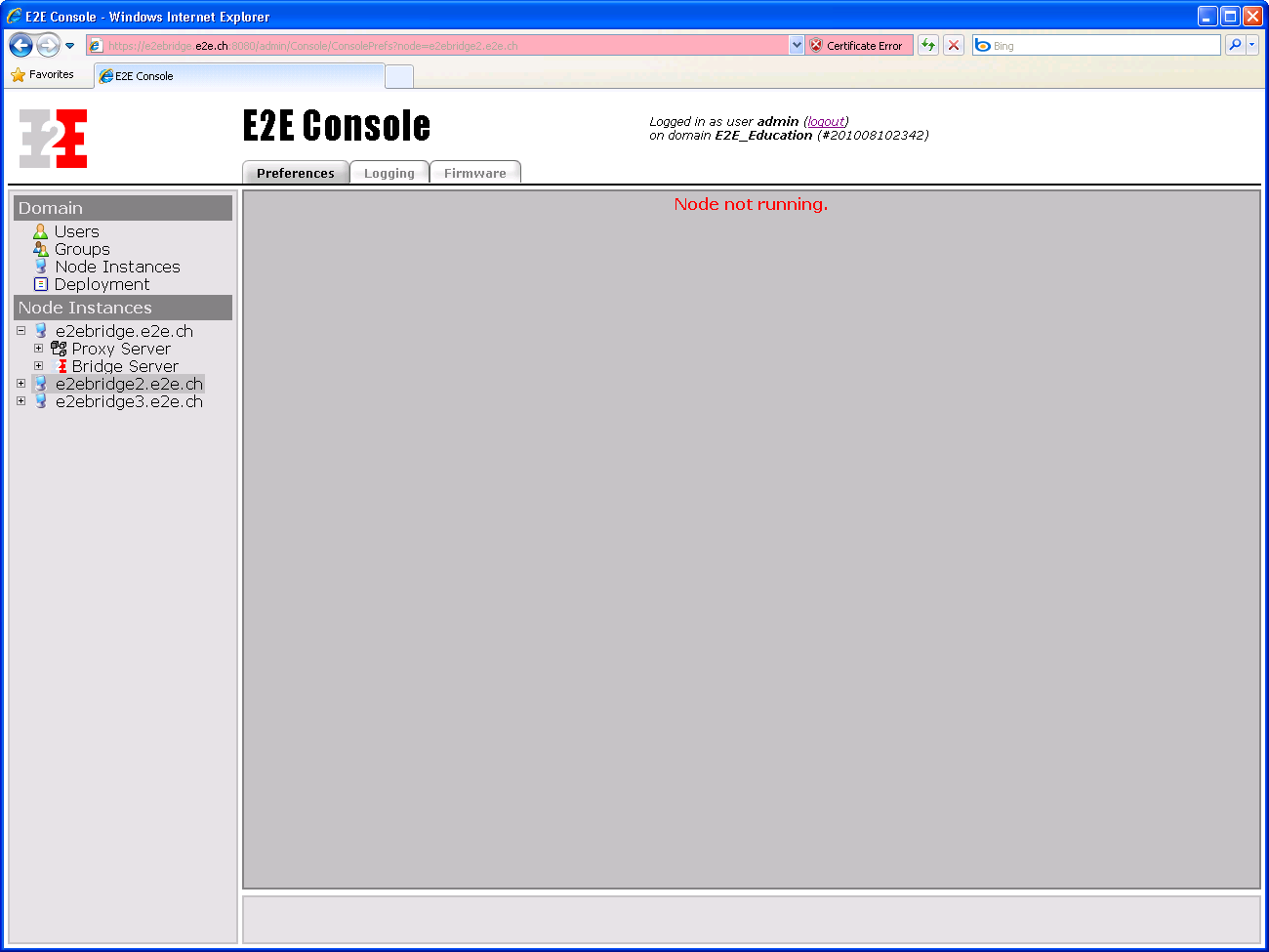 If the system is running normally and E2E Console service is running, too, the domain might be in an inconsistent state. In this case, try to remove the erroneous node instance from the domain by using the force removal option. Then, try to re-import the node instance again.