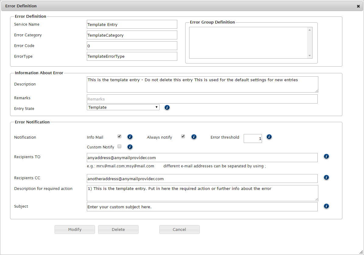 Click Modify to save the changes you made. Click Delete to delete the error group and all assignments to errors.
