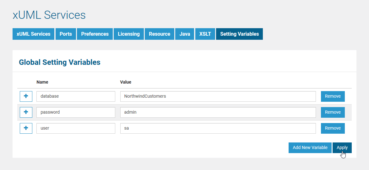 By using the button Add New Variable, you can define one or more new setting variables.