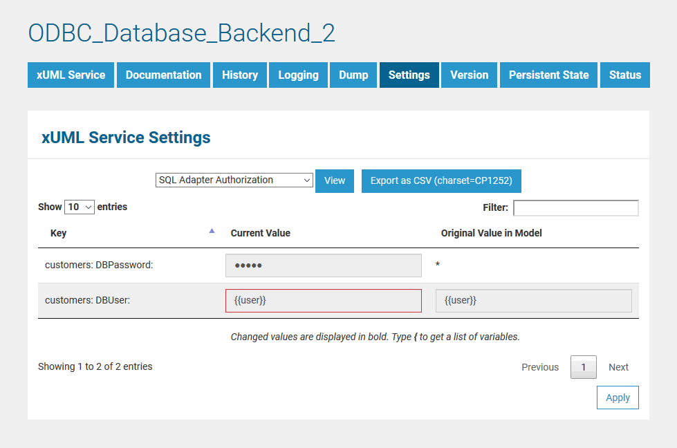 Click Apply to save your changes. The original value of the setting coming from the service model will still be displayed in a separate column on the right. The bold value of the setting indicates, that this setting has been changed from its original value.