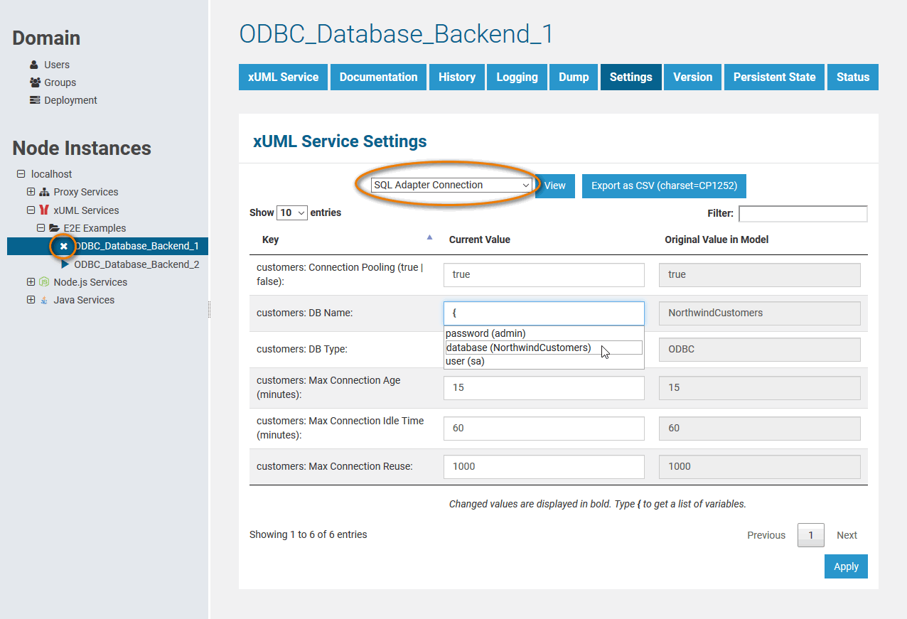 Switch to the service you want to use a setting variable with and stop it (ODBC_DatabaseBackend_1 in the example below). Settings can only be changed on stopped services. Then, switch to the Settings tab and and select the type of settings you want to change (SQL Adapter Connection in the example below).
