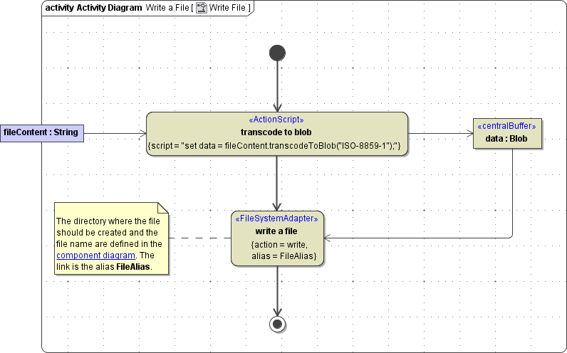 The directory where the file should be created and the file name are defined in the component diagram. The link from the activity diagram to the physical information is established by an alias (in the present example: FileAlias). See File System Components for more information on file system aliases.