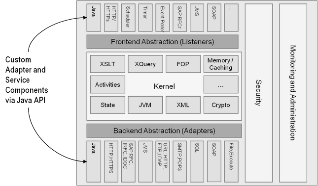 Frontend adapters are mapping incoming requests to the frontend abstraction layer. Several protocols and products are supported (third party / OEM adapters.) The xUML Runtime contains a comprehensive set of native frontend / backend adapters like SAP, SOAP, Java, SQL, HTTPS, FTP, LDAP, etc.