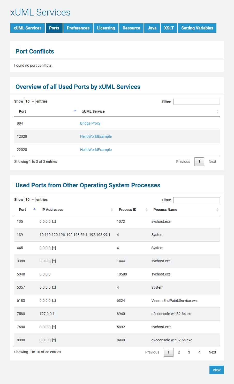 All possible port conflicts will be listed in red. This includes also conflicts concerning stopped services, as a port assigned to a service that is momentarily stopped is reserved to this service.Overview of all used Ports by xUML Services