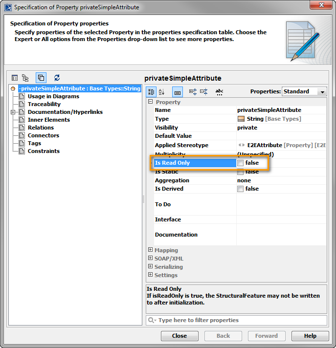 As soon as <<E2EAttribute>> is applied, additional specifications can be made in the Settings section of the specification dialog of the attribute.