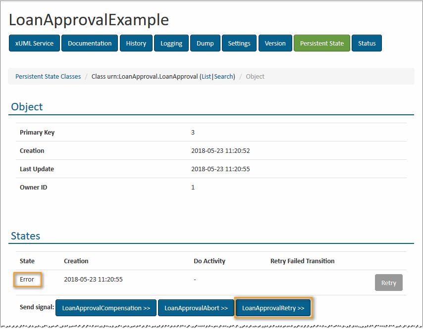 The service interface part (e.g. BPMNLoanApprovalServices) contains a persistent state class that is derived from the abstract definition generated from the BPMN. This class contains overridable operations that are called by the xUML Runtime on unhandled signals and errors.