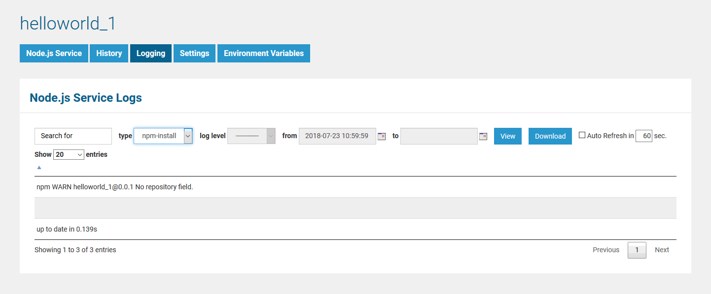 Select npm-install from the Type drop-down list to view the installation log. You cannot select a date range, as the npm-install log will be overwritten each time the command is executed.
