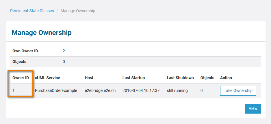 • In a Load Balancing scenario in which multiple services share the same objects, go to Manage Ownership on the Persistent State tab of one of the other services. The owner IDs of all services owning objects are listed in a table, together with service name and host.