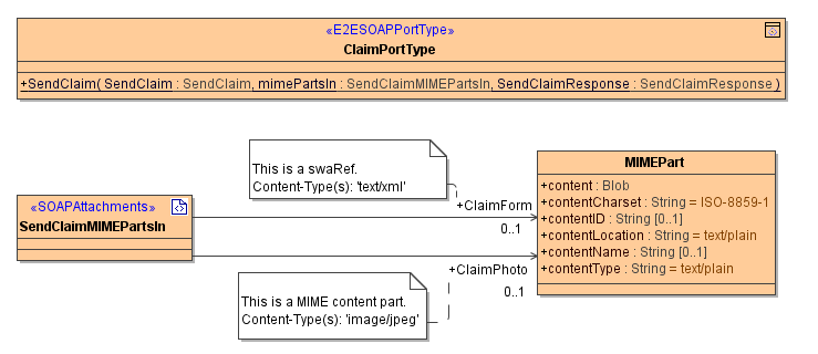 The WSDL port type ClaimPortType (line 34) has the operation SendClaim (line 35). Its input message is defined in line 25 containing two parts, ClaimDetail and ClaimPhoto. ClaimDetail is just a standard SOAP body but ClaimPhoto is a MIME content because this part is used in the MIME content binding in line 54. Thus, ClaimPhoto is put into the <<SOAPAttachmants>> class SendCliamMIMEPartsIn. Besides this explicit MIME binding, there is also an implicit reference to a MIME part using the SwA reference mechanism on line 19. This leads to an additional MIMEPart in the SOAP attachments class, namely ClaimForm.