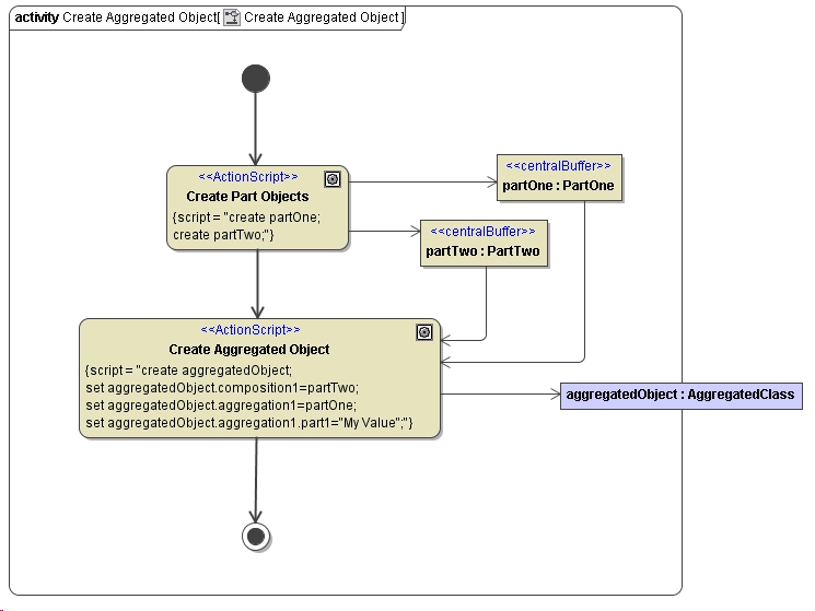 For instance, aggregated classes need to be instantiated first. The resulting objects may be assigned to the attribute, which have the same name as the association end name of the aggregated class. In action node Create Aggregated Object, an instance of class PartTwo is assigned to the attribute composition1 of object aggregatedObject. composition1 has been defined as association end name in the class diagram in figure Class Aggregations and Compositions.