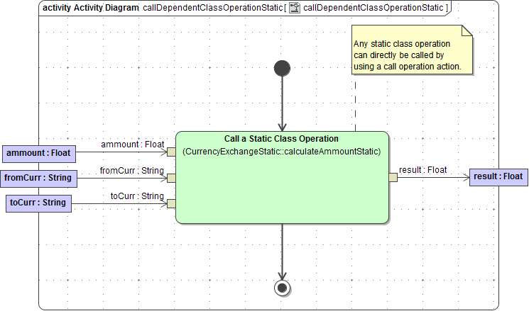![]() | This class operation can easily be used in any activity diagram. Easy way is to drag and drop the operation from the containment tree directly into your activity diagram.A call operation action linking to the selected class operation will be created automatically - together with all needed pins for you to connect to the related objects via object flows. |