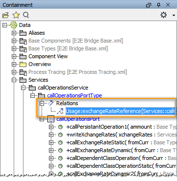 | Service operations implemented below callOperationsPort cannot access classes defined in package Classes, because they are not part of the same branch in the containment tree. If a superior class (like callOperationsPort in our example) is having a <<use>> dependency to a another class 1 implementing a class operation (like ExchangeRateStatic in our example), all subordinated objects 2 of that class (callOperationsPort in our example) can instantiate the dependent class and use their operations via that <<use>> dependency. |