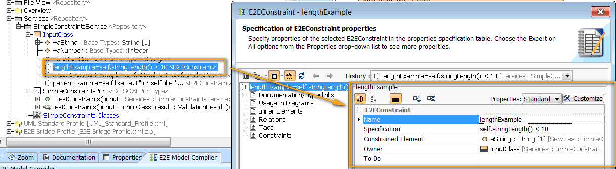 After having specified the constraints on a class and its attributes we can validate these constraints by using the <<ValidateConstraints>> action: