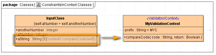 The constraint applied to aString uses the objectX . This object must be an instance of a <<ValidationContext>> class that is provided as input to the <<ValidateConstraints>> action as shown in the figure below: