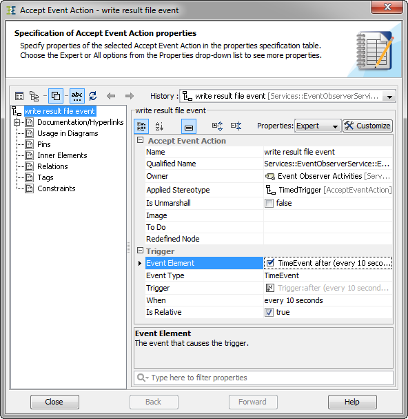 The hour glass symbolizes time events. To configure this symbol, open the time event specification dialog, select whether the time event is absolute or relative, and enter a time expression such as every 10 seconds.