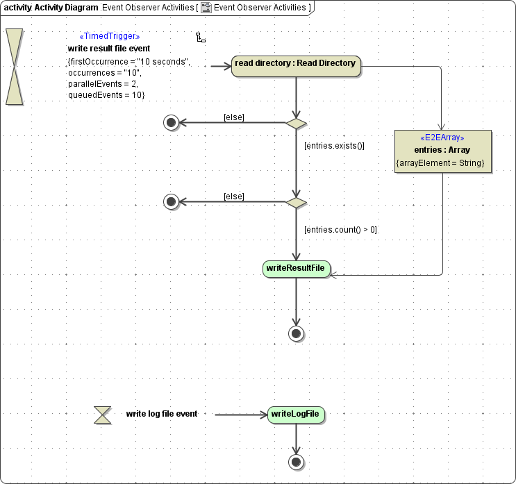 The activity Modeling the Behavior of an Event Observer models the behavior of an Event Observer class by defining the time events and the handlers of the time events. The activity has no initial state. Instead, the targets of both time-triggered transitions define the start points of the event handler. An event handler start point can be any activity, such as the sub-activity Read Directory or a call operation action calling an operation of the Event Observer class (for instance writeLogFile). In Modeling the Behavior of an Event Observer, one time event triggers a lookup in a directory. If this directory contains files, the activity calls the Event Observer operation writeResultFile. The implementation of this sub-activity operation call is not shown here. Refer to the example file.