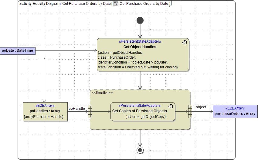 Besides using identifier conditions, it is also possible to have a state condition to select objects being in a given state. This is done using the stateCondition tagged value. It refers to a given state. An example can be found in the activity diagram Get Purchase Orders By Date described in Getting Copies of Persistent State Objects.