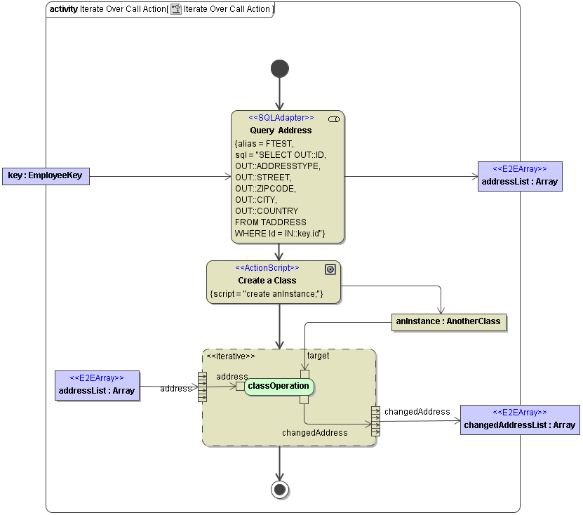 Within the Expansion Region with the stereotype <<iterative>> you can draw any E2E Bridge Adapters, in this Example an SQL Adapter. The Expansion Region allows one input Array and several output Arrays. It loops over the input Array and uses internally the temporary variable given in the Expansion Node. If the name of the Expansion Node corresponds to the parameter of the adapter, any Object Flow within the Expansion Regions are optional. The iteration over Adapter also supports input and output Pins on the Adapter. This means you can do a mapping between the temporary variable name given in the Expansion Node and the input Pin of the Adapter (see example above). Any Static Variable that has to be available for all iterations can directly be attached by an Object Flow into the Adapter. For this purpose no Expansion Nodes are used. The Object Flow can be directly connected to the Adapter or by input Pin. Like in the Example "Iterate Over Action Script" any output variables must be created by the adapter. The Output Variable must be named by an output Expansion Node on the frame of the Expansion Region. It will then append an item in the associated Array Item. With the usage of output Pins on the adapter a mapping to a different name of the temporary Array Item is possible.