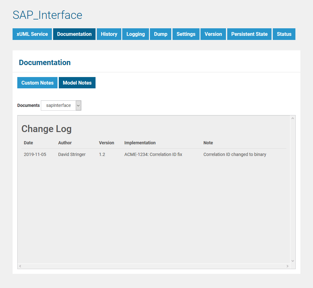 If service modelers provided a change log table with their deployed services, this change log will be visible in the Model Notes section of the Documentation tab.