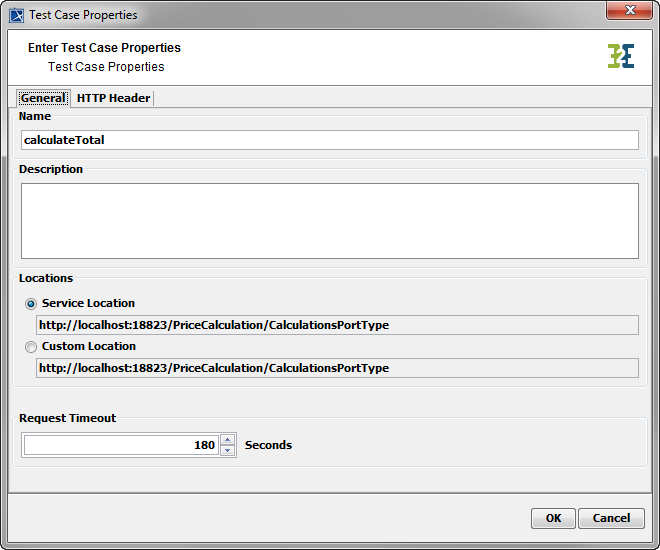 Right-click a test case and select Properties to open the properties dialog. It contains two tabs: General and HTTP Header.