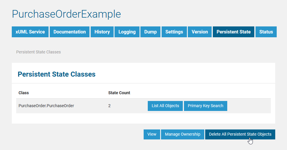 The initial page displays an overview of all persistent state classes and their states, in this example PurchaseOrder. As the xUML service was just started, no states have been created yet and State Count is 0. This is also why no list of all objects can be retrieved and no primary key search can be started. The corresponding buttons are all disabled.