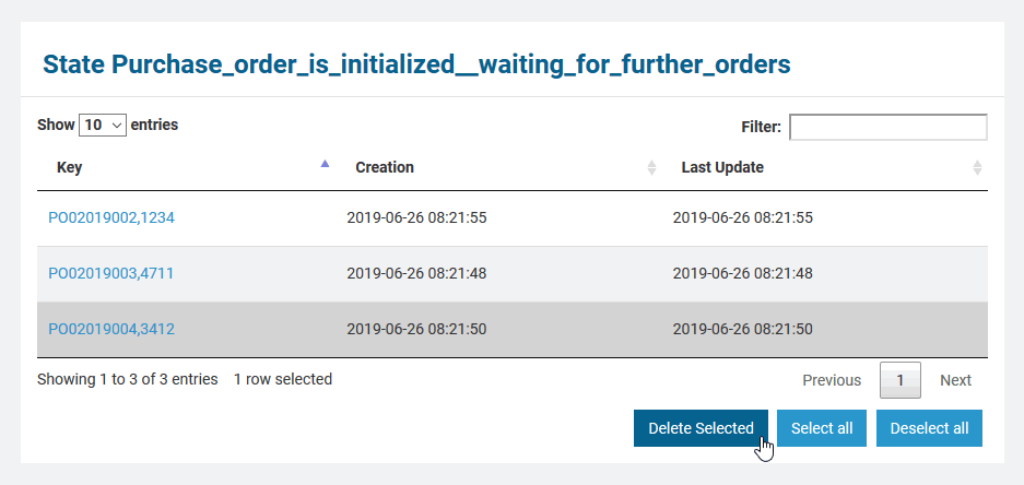 After creating some objects of the persistent state class (e.g. purchase orders), all objects can be listed.